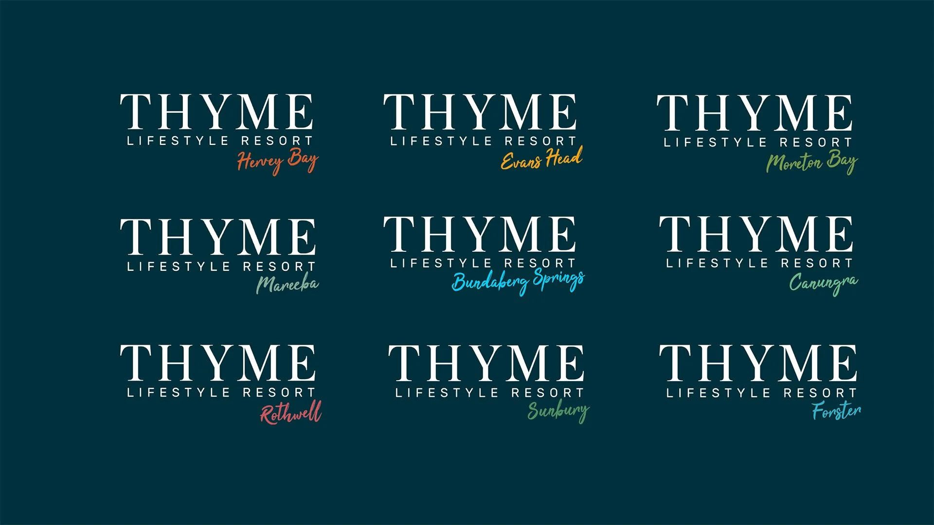 Reflecting on the freedom a Thyme Lifestyle Resort brings and the possibilities this creates, the visual identity was based around a clean typography based logo with dynamic elements shifting and shaping to the different communication needs - from adaptive headlines to bespoke location based colour palettes.
