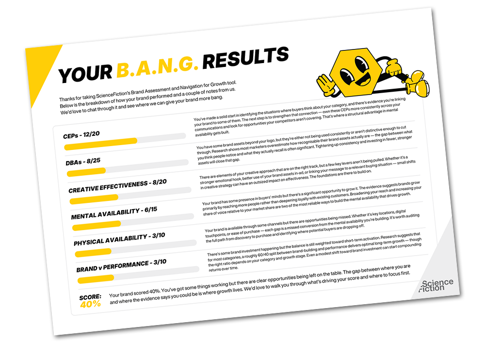 B.A.N.G. (Brand Assessment and Navigation for Growth) is a free diagnostic tool that scores your brand across six evidence-based dimensions. From how well you're linking to buying situations, to whether your brand assets are actually as distinctive as you think they are.
